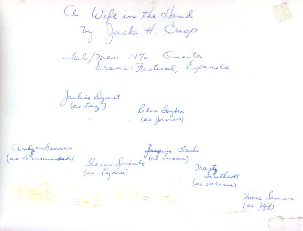 Rise and Shine Nov 26, 27, 29 (Espanola High School) The Brick and the Rose Nov 26, 27, 29 (Espanola High School) A Wife in the Hand Feb 27, 28 (Espanola High School), Mar 10 (Espanola QUONTA)