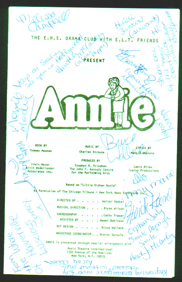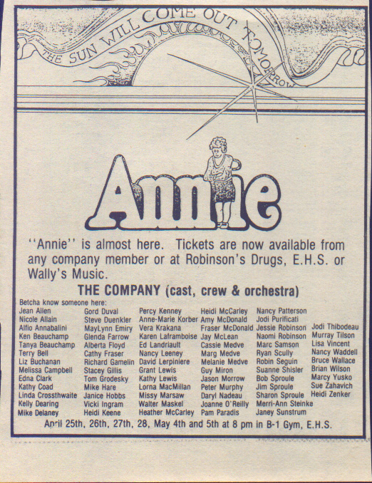 You're a Good Man Charlie Brown Jan 18, 19, 20, 21 (Espanola High School) Annie April 25, 26, 27, 28, May 4, 5 (Espanola High School) Androcles and the Lion Espanola Little Theatre Children's Dramatic Group July (Parks, playgrounds and festivals around Massey, Espanola and Sudbury) The Copetown City Kite Crisis Espanola Little Theatre Children's Dramatic Group August (Parks, playgrounds and festivals around Massey, Espanola and Sudbury)