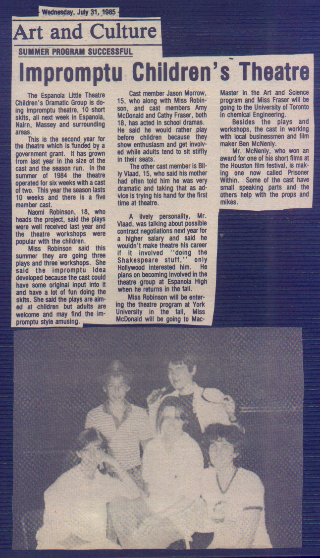 Shortshrift Espanola Little Theatre Children's Dramatic Group July (Parks, playgrounds and festivals around Massey, Espanola and Sudbury) A Flock of Improvs Espanola Little Theatre Children's Dramatic Group July (Parks, playgrounds and festivals around Massey, Espanola and Sudbury) Beware the Quickly Who Espanola Little Theatre Children's Dramatic Group August (Parks, playgrounds and festivals around Massey, Espanola and Sudbury)