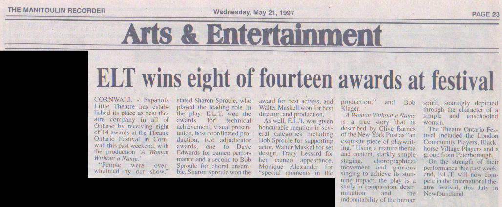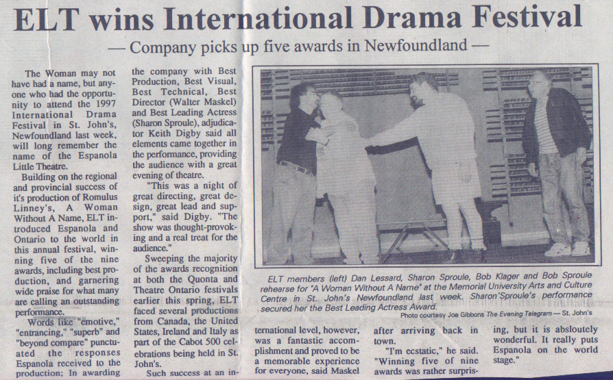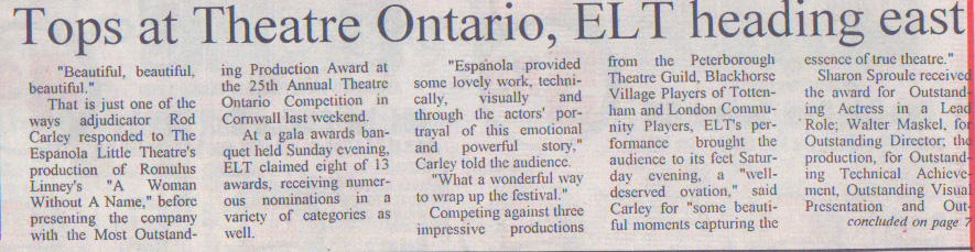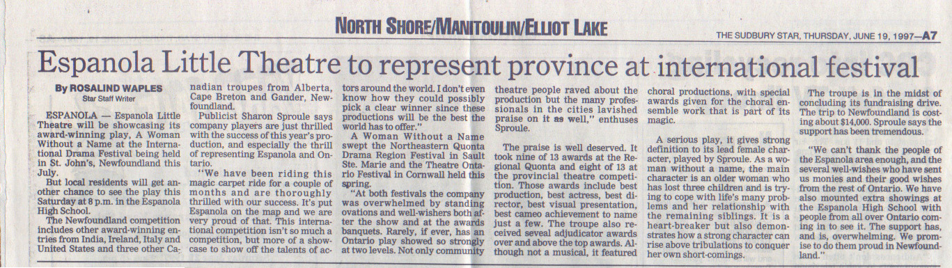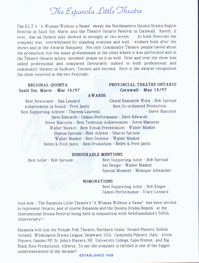 The Espanola Little Theatre, Box 5082 Espanola, Ontario P5E 1S1 (705) 869-8698