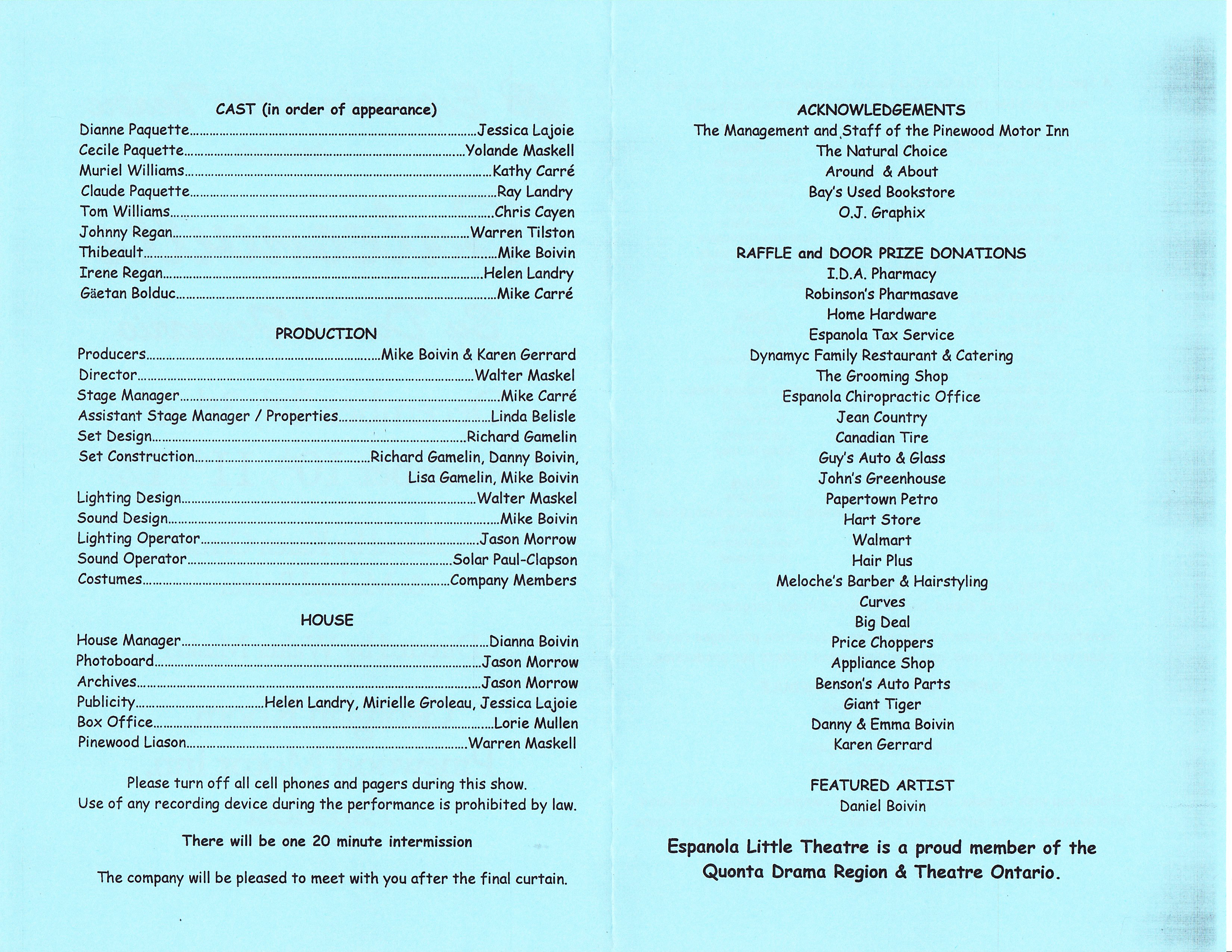 The Espanola Little Theatre, Box 5082 Espanola, Ontario P5E 1S1 (705) 869-8696